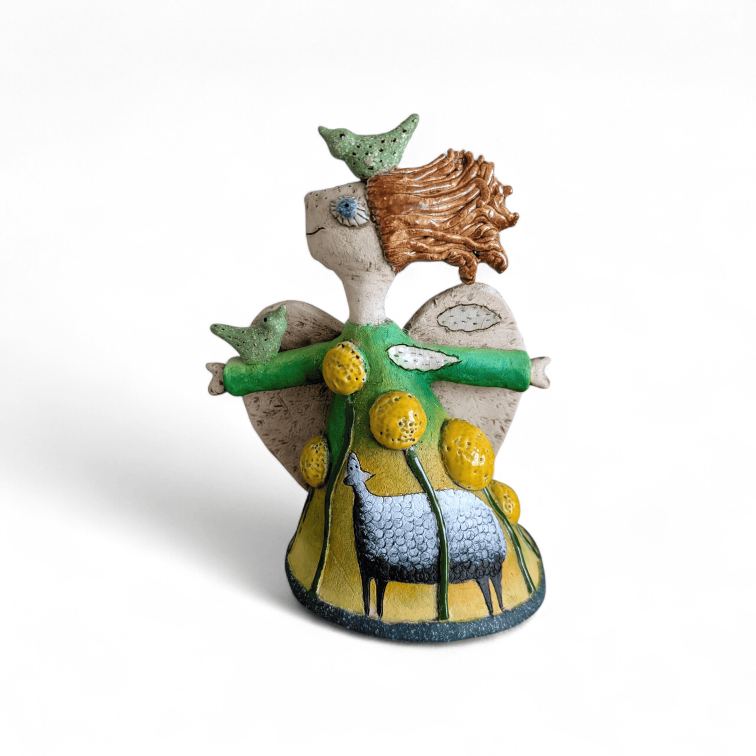 Angelas iš šamotinio molio yra autorinis keramikės Dangiros Pyragaitės kūrinys pagamintas iš smulkaus šamotinio molio. Autorės naudojamos technikos: glazūra ir tapyba akrilo dažais. Jos darbai nukelia mus į pasakų, spalvų ir fantazijos pasaulį. Šis kūrinys puikiai tiks ieškantiems išskirtinumo ir originalumo.