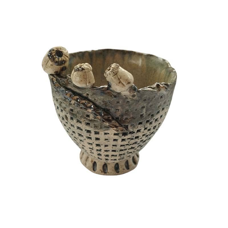 Dubenėlis su aguonomis yra autorinis kūrinys lipdytas rankomis iš šamotinio molio, nuglazūruotas ir išdegtas 1240 temperatūroje.  Dubuo tinkamas sąlyčiui su maistu.