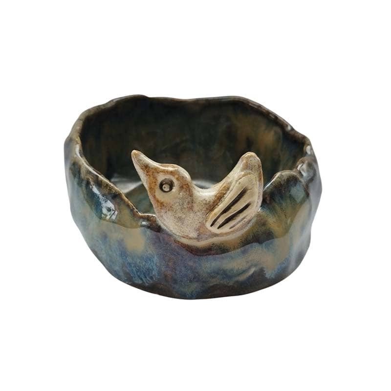 Dubenėlis su paukščiu yra autorinis  kūrinys nulipdytas iš šamotinio molio, nuglazūruotas  ir išdegtas 1260 temperatūroje. Dubuo tinkamas sąlyčiui su maistu.
