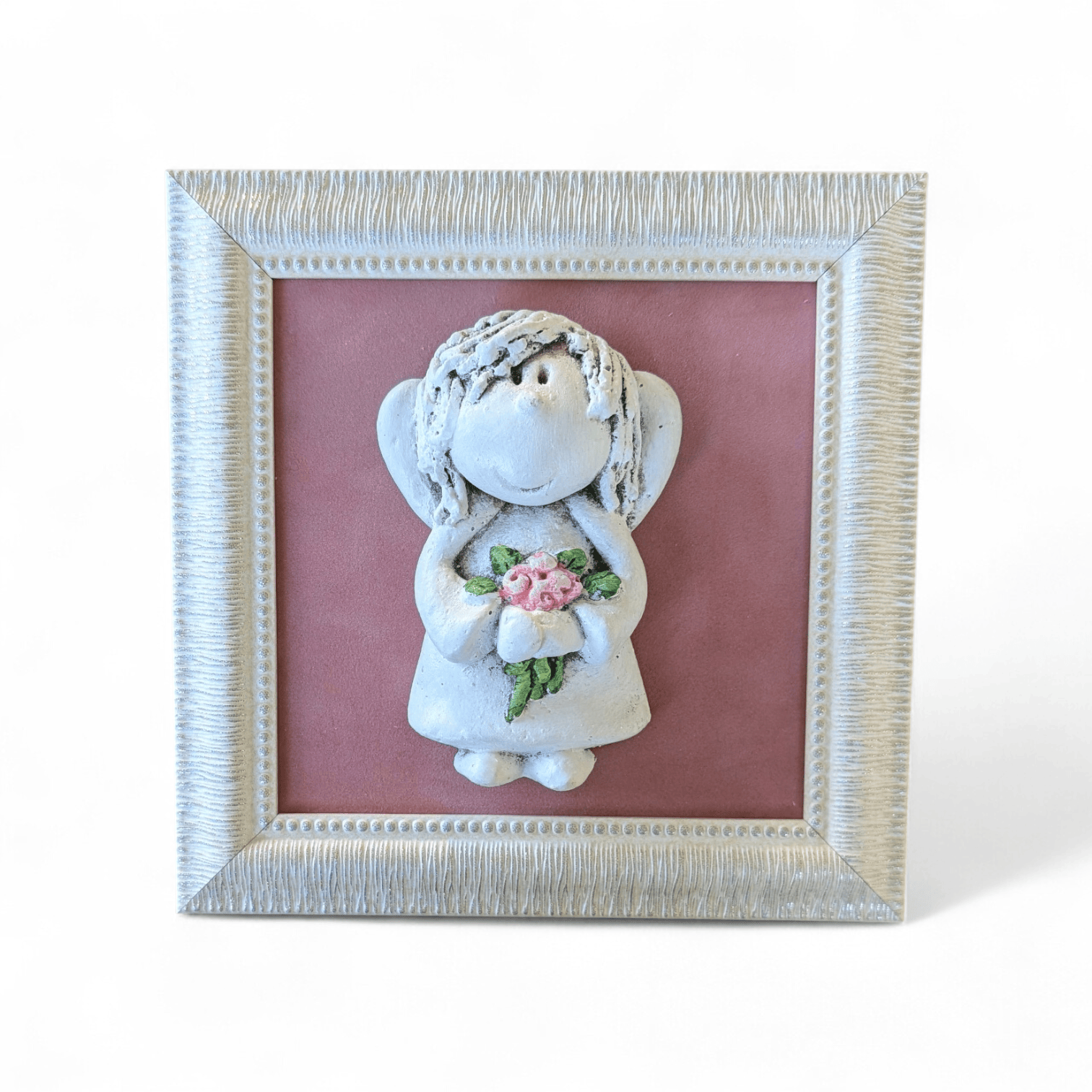Įrėmintas keramikinis angeliukas rankų darbo pagamintas iš  balto molio ir nuglazūruotas. Įrėmintas plastikiniame rėmelyje.