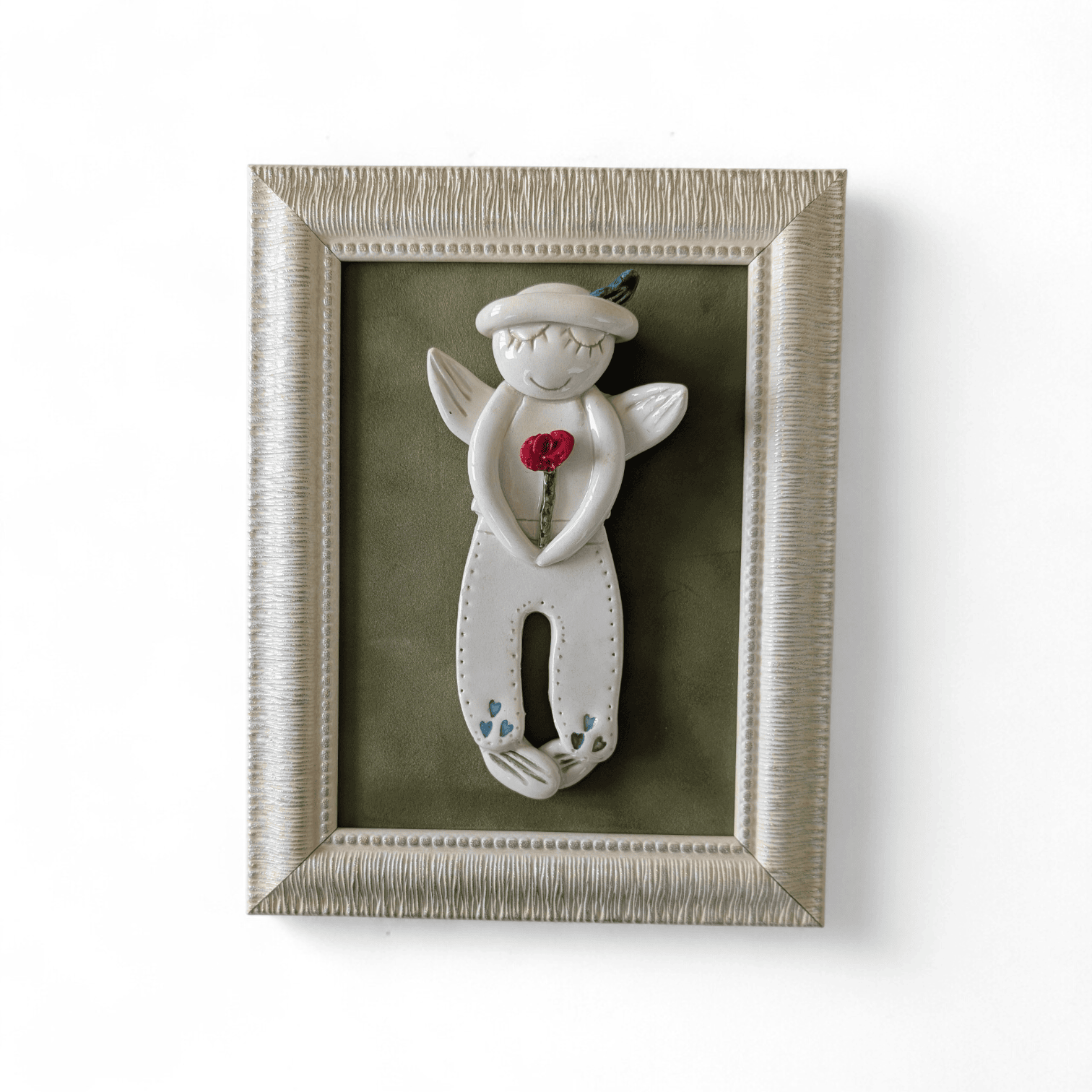 Įrėmintas keramikinis angeliukas rankų darbo pagamintas iš  balto molio ir nuglazūruotas. Įrėmintas plastikiniame rėmelyje. Dovanoti keramikinį angeliuką tinka įvairiausioms progoms: krikštynoms, gimtadieniams, palankynoms, įkurtuvėms, pirmąjai komunijai ir pan.