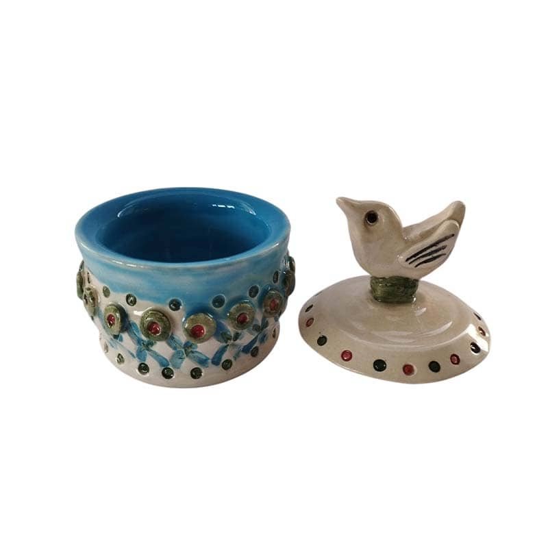 Keramikinė dėžutė – paukštis yra autorinis kūrinys, pagaminta iš balto molio, nuglazūruota. Tinka sąlyčiui su maistu.