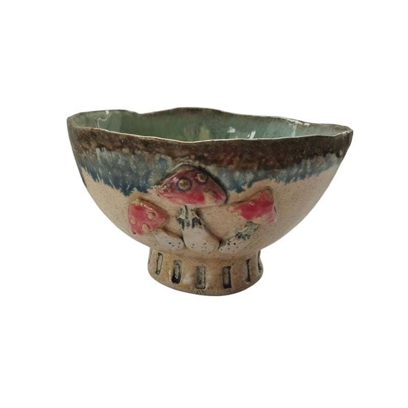 Keramikinis dubenėlis su grybais  yra autorinis kūrinys lipdytas rankomis iš šamotinio molio, nuglazūruotas ir išdegtas 1240 temperatūroje.  Dubuo tinkamas sąlyčiui su maistu.