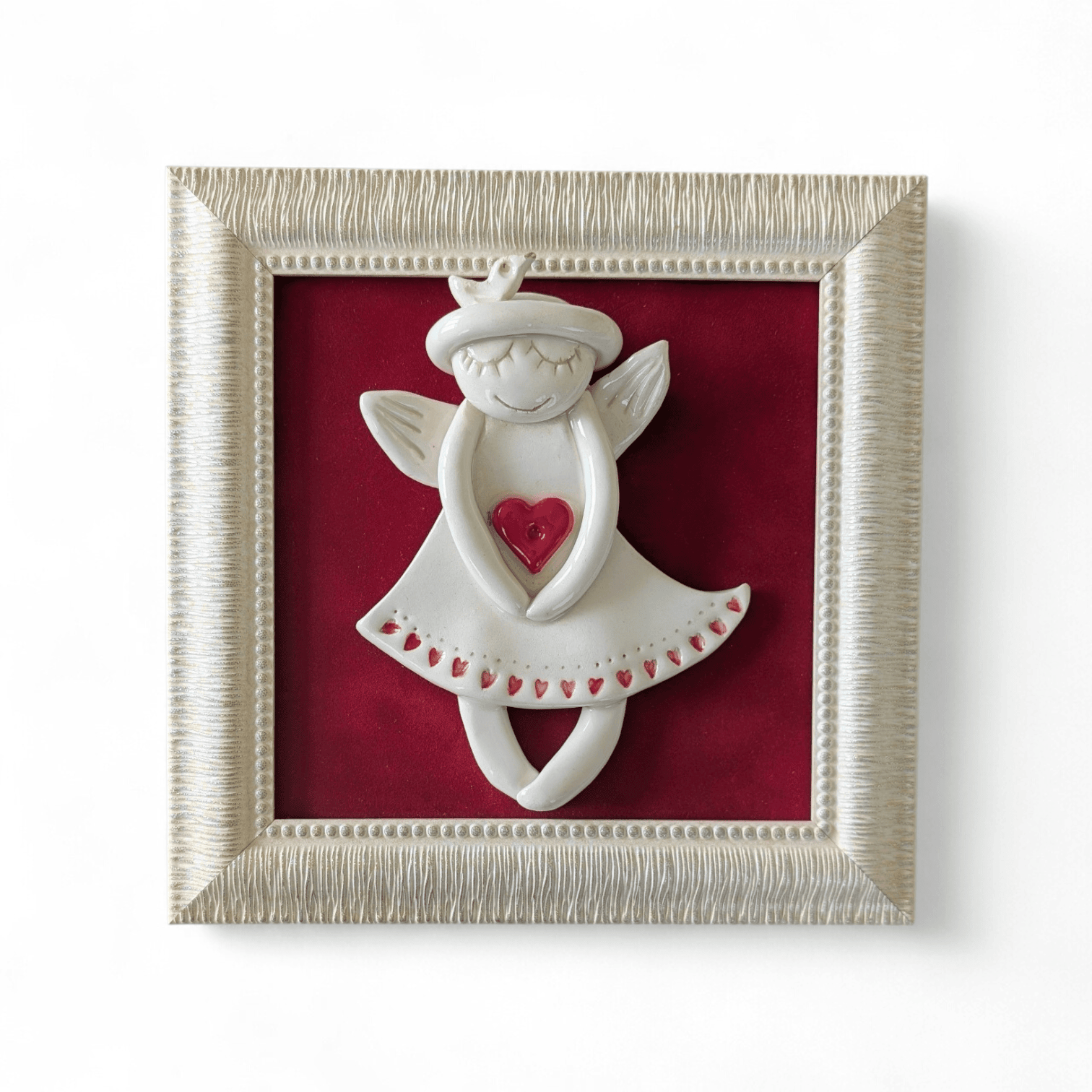 Paveikslas su angelu yra autorinis kūrinys pagamintas iš šamotinio molio ir nuglazūruotas. Paveiklas įrėmintas plastikiniame rėmelyje. Paveikslą galima pakabinti ir pastatyti.