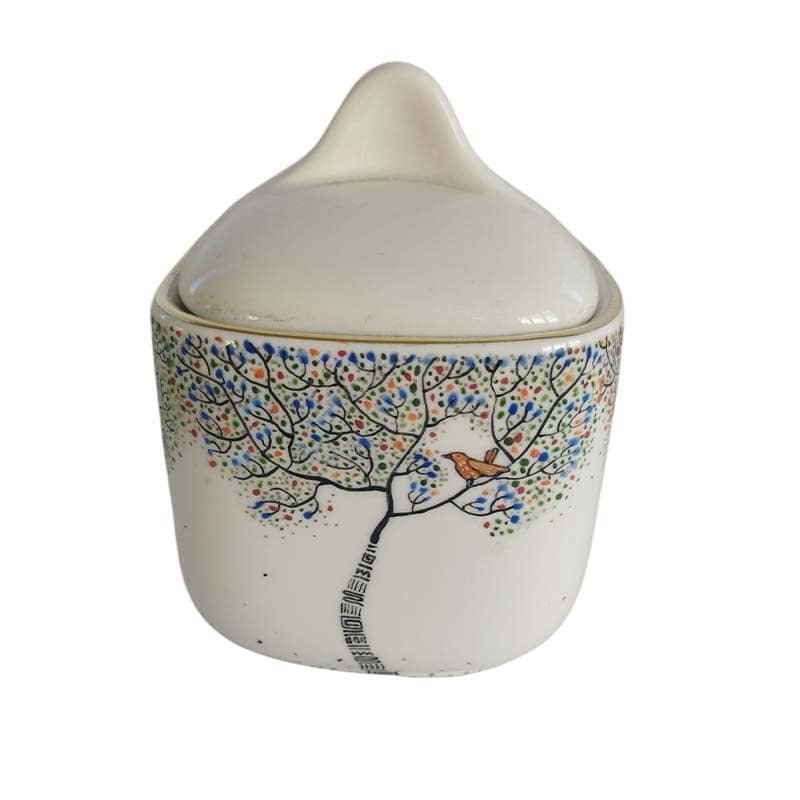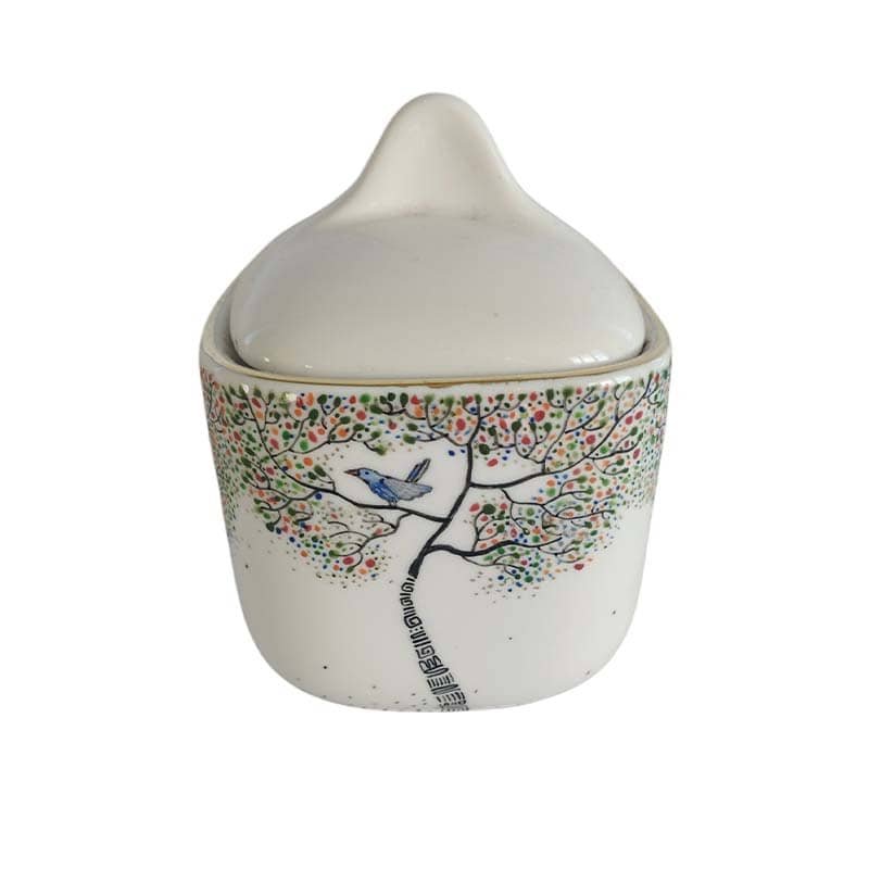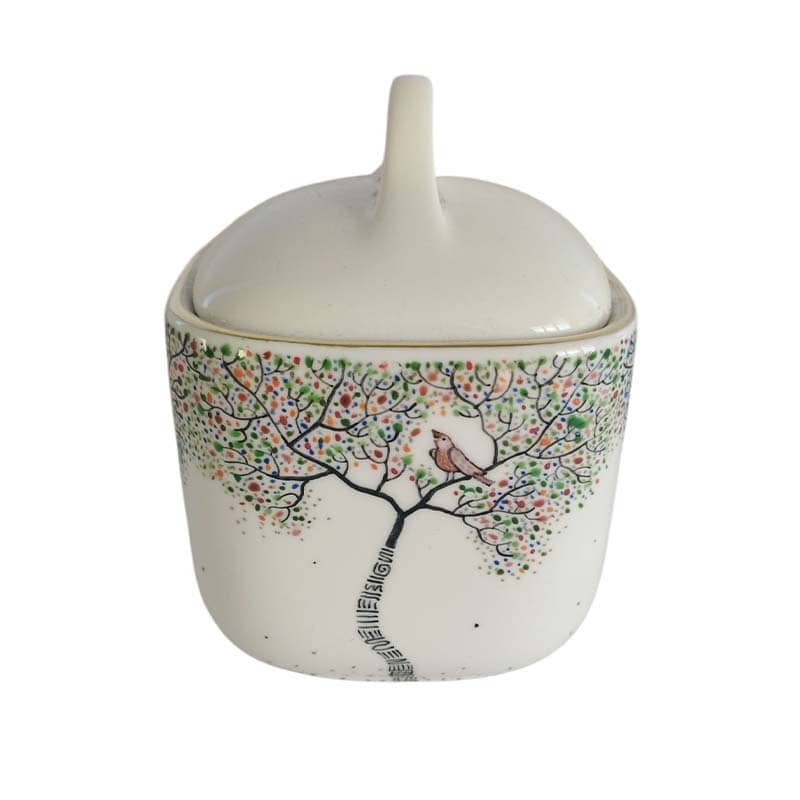 Porcelianinis dubenėlis-cukrinė medžiai yra rankomis puoštas porcelianas. Piešinys degamas 800-900 temperatūroje keramikos krosnyje. Vėliau detalės dekoruojamos auksu. Kadangi gaminys puoštas auksu nerekomenduojama plauti indaplovėje.