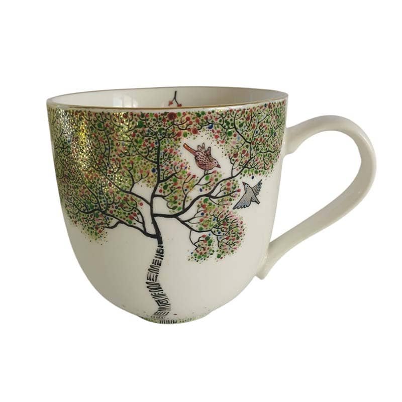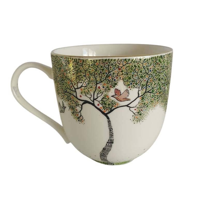 Porcelianinis puodukas medžiai  yra rankomis puoštas porcelianas. Piešinys degamas 800-900 temperatūroje keramikos krosnyje. Vėliau detalės dekoruojamos auksu. Parduodama kartu su lėkštute. Kadangi gaminys puoštas auksu nerekomenduojama plauti indaplovėje.